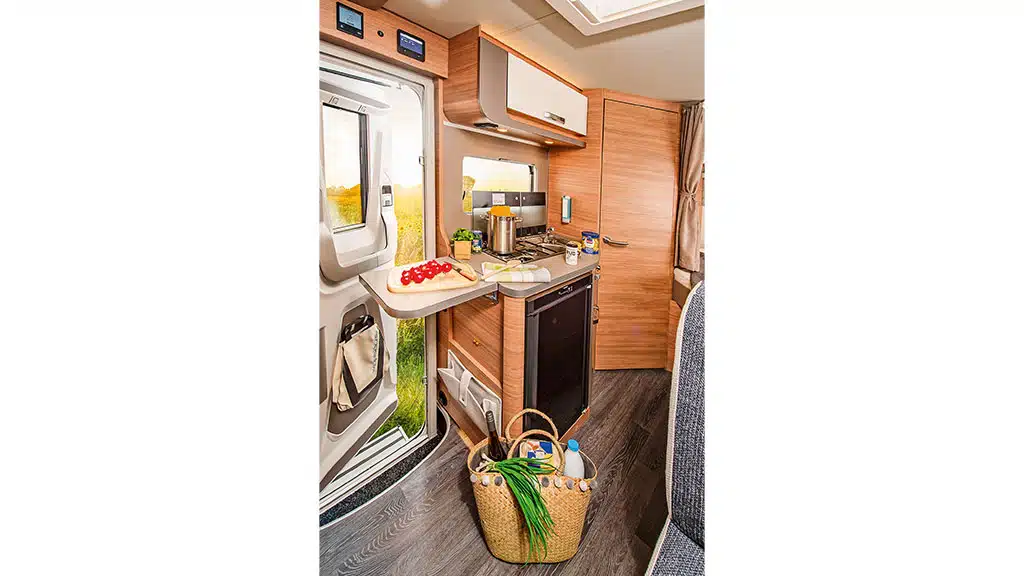 Neben der Aufbautür steht der Küchenblock mit Kombination aus zweiflammigem, elektrisch zündendem Herd und Spüle sowie dem im Unterschrank eingebauten 98-Liter-Absorberkühlkschrank mit beidseitig öffnender Tür. Letzterer kostet den Unterschrank einiges an Stauraum, dafür nimmt das Gerät vom übrigen Innenraum keinen Platz weg. Zwischen Sitzbank und Bettfußende befindet sich wegen des dort platzierten, über eine Außentür zugänglichen Gasflaschenkastens ein halbhoher Raumteiler mit Abstellfläche darüber, die sich beim Kochen sehr gut nutzen lässt. Auch bietet das seitlich am Küchenblock angebrachte Klappbrett zusätzliche Arbeitsfläche.