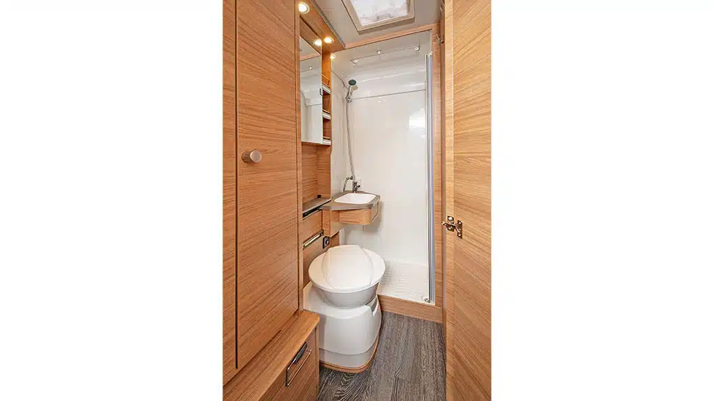 Im Längsbad bringt Weinsberg gleich neben der Tür einen hohen Kleiderschrank unter. Das Waschbecken über der Drehtoilette ist in Richtung der abgeteilten Dusche ganz im Heck verschiebbar. Die Duschtüren schließen gut, ebenso die Badtür. Der Gang an der Toilette vorbei in die Dusche ist etwas beengt, aber auch dies ist bei diesem Grundriss normal. Die Dachhaube jedoch sollte für einen besseren Luftaustausch größer sein.