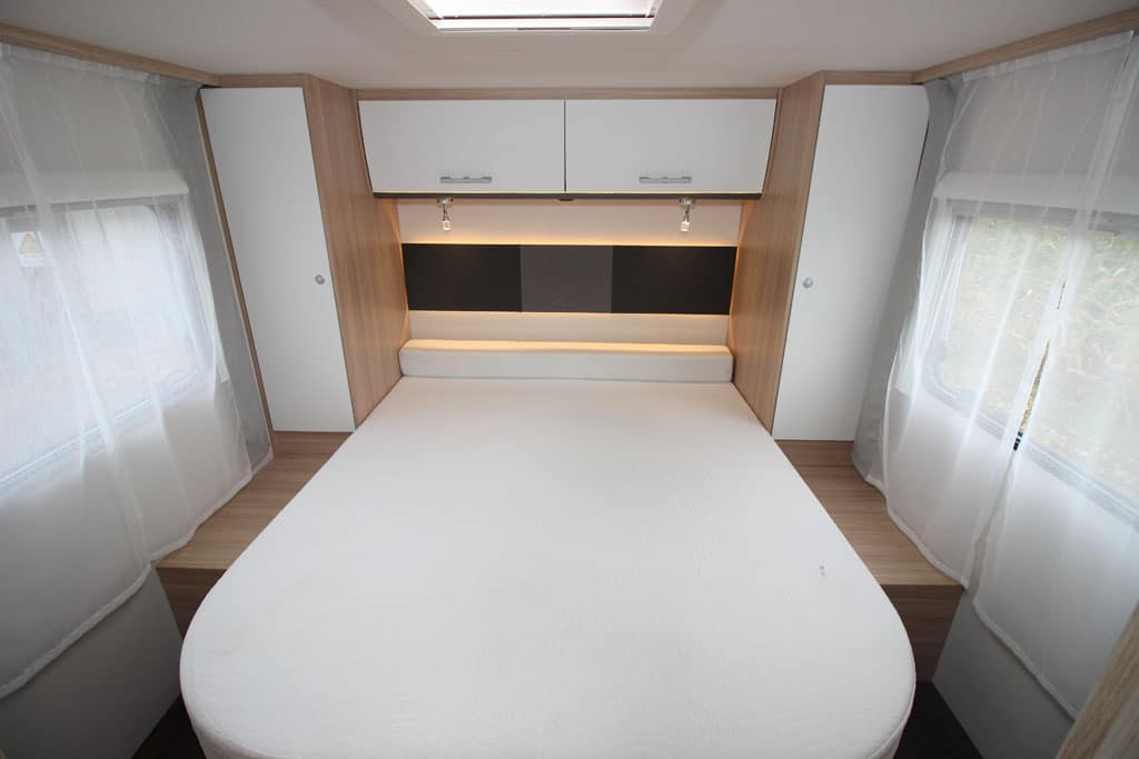 Während Längseinzelbetten hierzulande zur beliebtesten Betten-Variante zählt, setzen unsere südeuropäischen Nachbarn auf das Queensbett. Zugegeben, es erscheint gerade mit Familie nicht die erste Wahl, für zwei Personen ist die Variante jedoch gut geeignet. Vorteil dieser Bettenvariante im Heck: Das Schlafgemach ist geräumig und erlaubt den Zugang ins Bett von beiden Seiten. Dies geht ein wenig zulasten der Staumöglichkeiten. Für Klamotten sind zwei Schränke inklusive Licht und zwei Fächer vorgesehen. Um die Kleiderständer in den Schränken zu nutzen, müssen vorher allerdings die Bretter herausgenommen werden, wodurch Ablagefläche verloren geht. Falls notwendig, lässt sich das Bett durch ein Polster, das am Kopfende eingesetzt wird, verlängern.