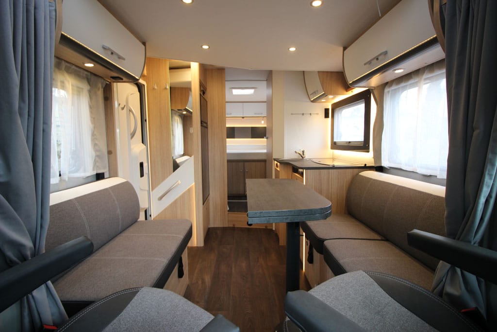 Der Wohnraum des T 69 LC ist mehr als großzügig. Das liegt in erster Linie daran, dass Sunlight hier einem aktuellen Trend folgt und sich für zwei gegenüberliegende Längssofas entscheidet. Die Faceto- face-Couchlösung taucht dabei erstmals im Portfolio der Hymer-Tochter auf und ermöglicht in dieser Lounge-Anordnung bei gedrehten Frontsitzen bis zu sechs Personen am Tisch Platz zu nehmen. Diese Variante hat darüber hinaus den Vorteil, dass das sonst bei Eckküchen oder L-Sitzgruppen in den Wohnraum hineinragende Element fehlt und damit ein durchgehend breiter Durchgang von vorne bis in den hinteren Bereich des Fahrzeugs gegeben ist. Gerade wenn das Wetter einmal nicht mitspielt oder die Temperaturen im Keller sind, weiß man den gemütlichen Wohnraum zu schätzen. Kinder finden viel Platz, sich auszubreiten. Der Tisch (92 mal 41/82 Zentimeter) ist verschiebbar und klappbar. Die Stabilität des Tisches in ausgeklappten Zustand ist gut, aber insgesamt noch verbesserungswürdig. Sunlight bestätigte, dass hier bis zur Serienreife weiter an einer Optimierung gearbeitet wird.