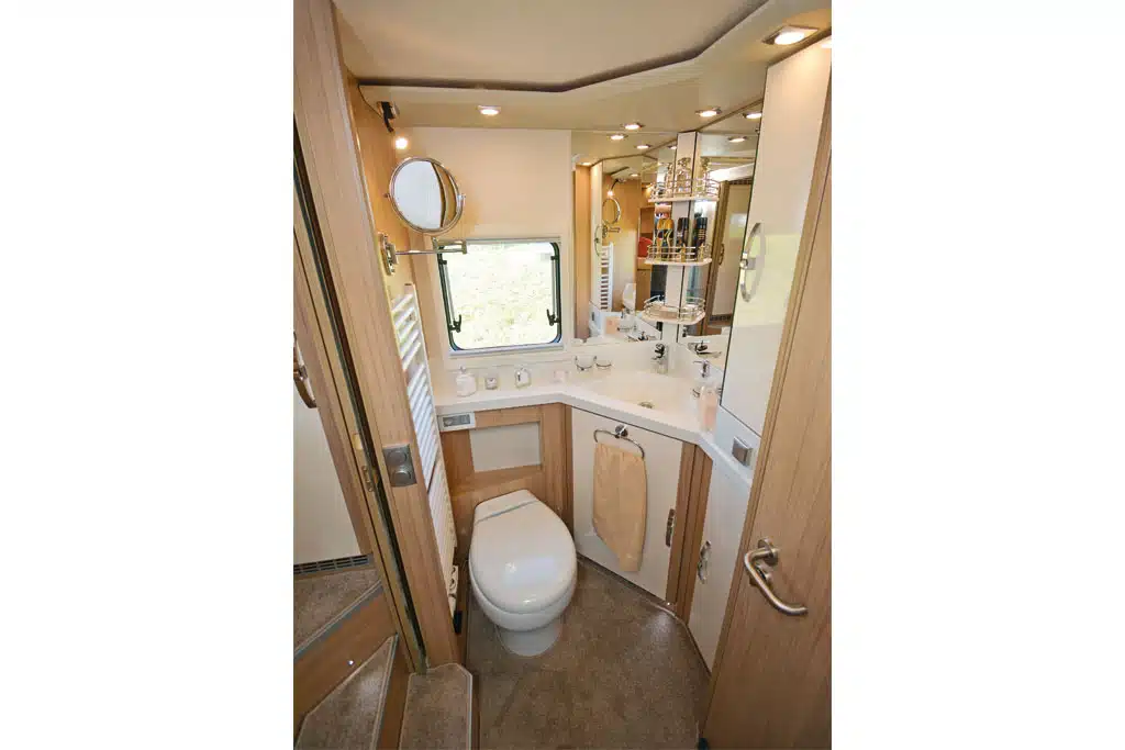 Im Raumbad genießt der Urlauber genügend Platz und durch ein Aufstellfenster den Blick nach draußen. Das auf Wunsch installierte Keramik-WC von Tecma mit Bidet und 230-Liter Festtank statt Kassettentoilette sowie die Dusche mit Echtglastüren beziehen ihr Wasser aus einem frostsicher im Stauraum-Doppelboden eingebauten 230-Liter-Frischwassertank. Das gleiche Volumen hat der dort ebenfalls winterfest platzierte Abwassertank.