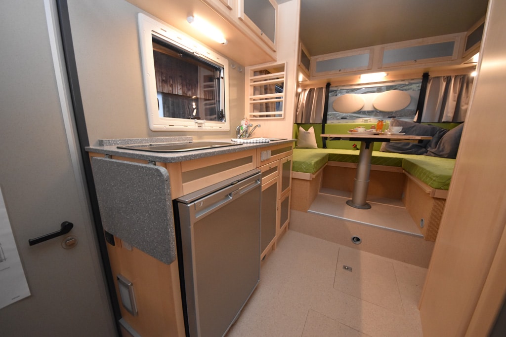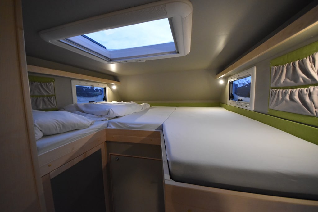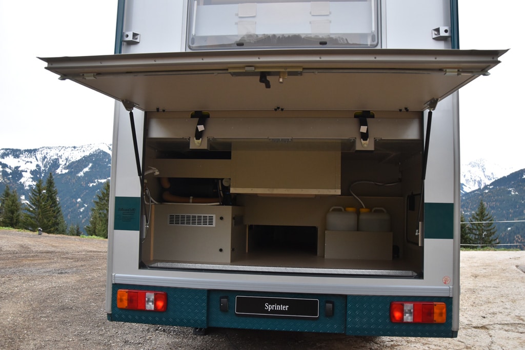 Doch der Reihe nach. Der LBX 365 ist mit 6,60 Meter Länge noch vergleichsweise kompakt, die Höhe von 3,27 Meter macht ihn aber trotzdem zu einer wuchtigen Erscheinung. Verantwortlich dafür ist neben dem Allrad-Chassis des Sprinters auch ein 28 Zentimeter hoher Doppelboden. Von außen und innen zugänglich, lässt sich hier jede Menge Ladegut unterbringen.