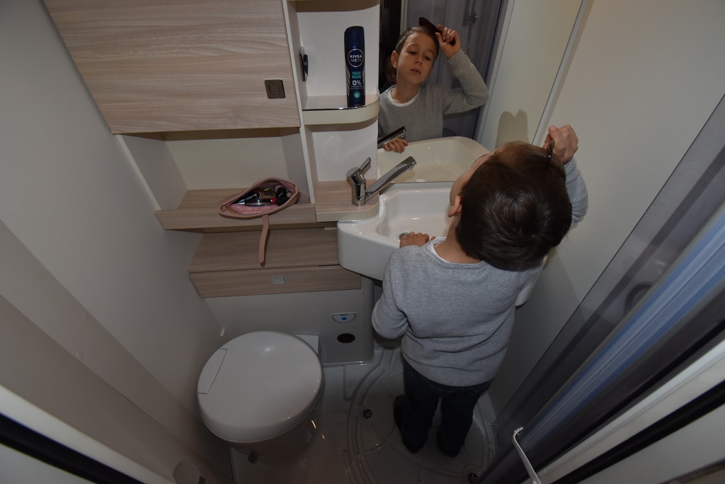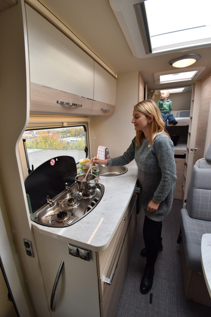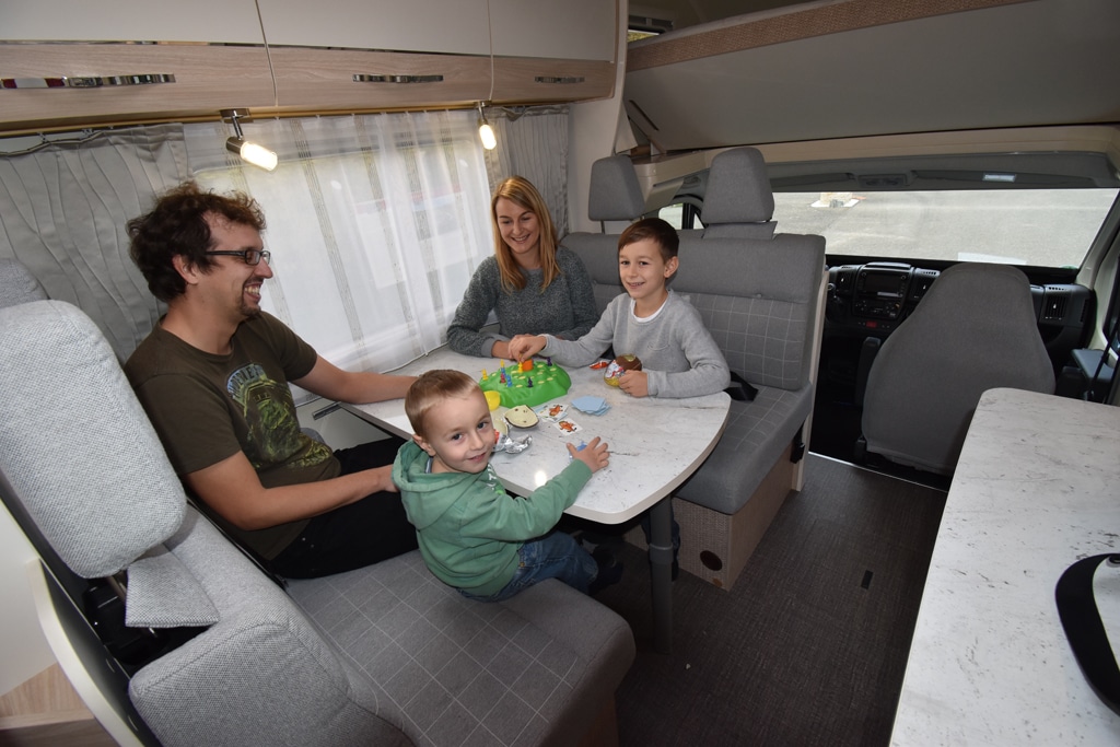 Familien-Check Nummer zwei folgt an der Sitzgruppe. Sie besteht aus einer Volldinette, die Bänke sind jeweils 105 Zentimeter breit. Da gegenüber die Küche steht und kein Platz für eine Längsbank bleibt, müssten sich bei einer Fünf-Personen-Besatzung drei (Kinder) auf eine Bank quetschen. Geht sicherlich, wirklich komfortabel essen wird dann aber schwierig. Dennoch ist es erstaunlich, wie viel Raum auf weniger als sechseinhalb Meter Außenlänge zur Verfügung stehen kann.
