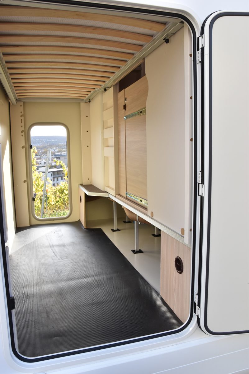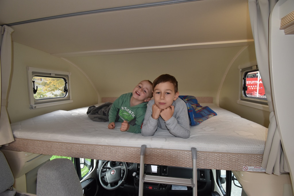 Eltern schlafen deshalb deutlich komfortabler im Alkoven. Hier misst die Matratze 200 mal 150 Zentimeter, zu den Wänden bleibt jeweils noch ein paar Zentimeter mehr Platz. Die Kaltschaummatratze ist hier wie in den Stockbetten im Heck aber nur acht Zentimeter dick. Um ohne Kopfnuss vom Wohnraum ins Fahrerhaus zu gelangen, lässt sich der Einstiegsbereich des Alkovenbettes hochklappen.