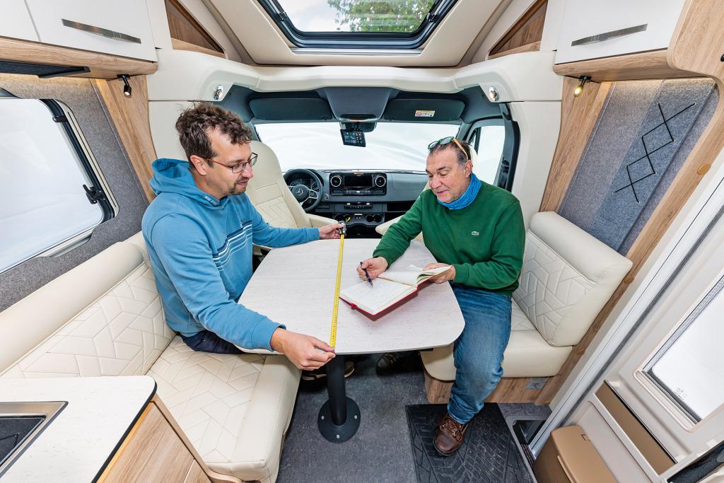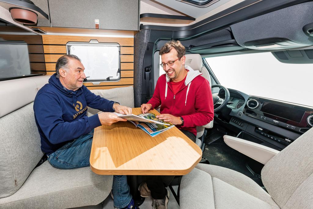 Nachteil der Face-to-Face-Konstruktion: Wollen mehr als zwei Camper mitfahren, muss umgebaut werden. Aus der fahrerseitigen Längsbank lässt sich ein Sitz mit Dreipunktgurt in Fahrtrichtung klappen, er ist jedoch weniger bequem als die feste Bank im Hymer. Die beifahrerseitige Bank ist zu kurz für einen weiteren Klappsitz.