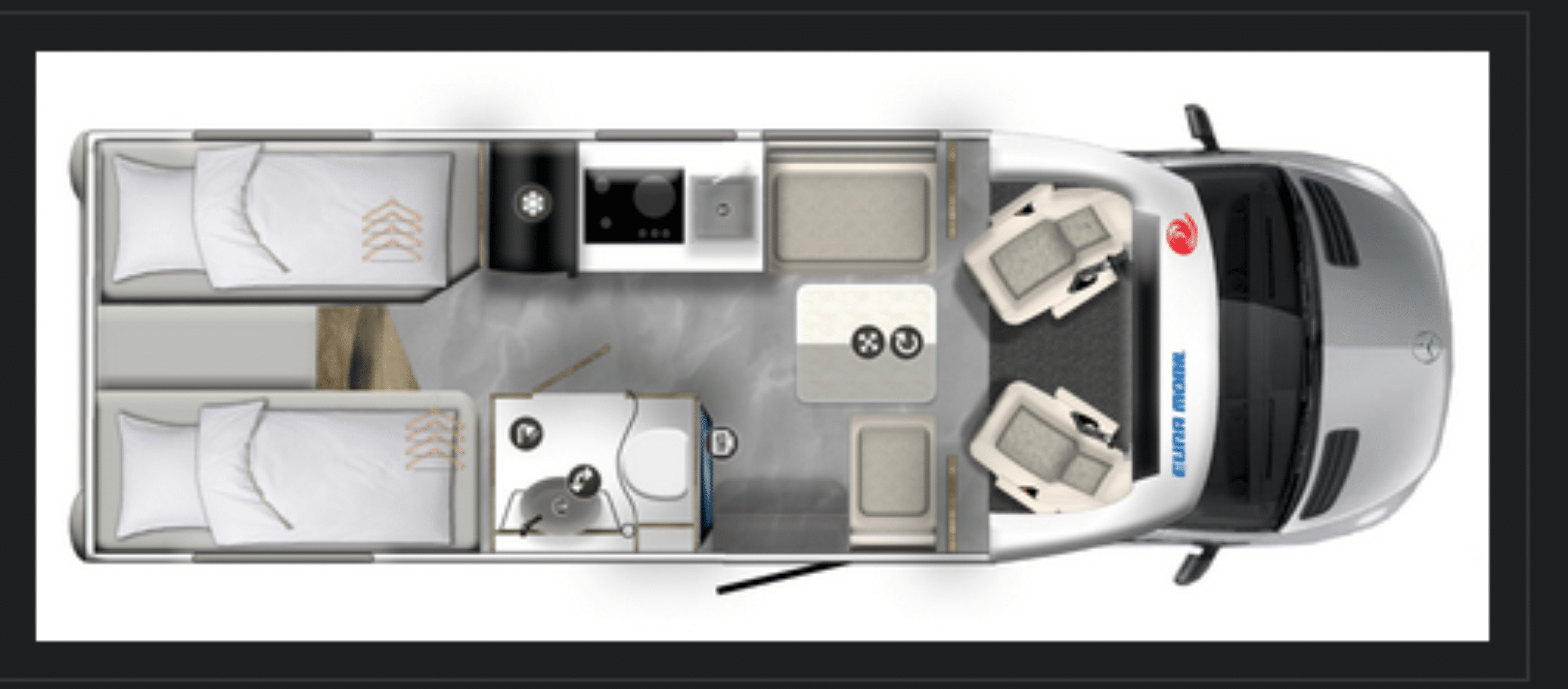 Bei der Raumaufteilung gehen Eura Mobil und Hymer ähnliche, aber nicht identische Wege. Einig sind sich Xtura und ML-T im Heck, hier übernachten zwei Camper in längs montierten Einzelbetten. Im Standard sind die Liegeflächen im Xtura ein paar Zentimeter länger. Hymer bietet aber für das beifahrerseitige Bett eine Verlängerung an, womit die Liegefläche auf deutlich mehr als zwei Meter wächst – ein Argument für großgewachsene Urlauber.
