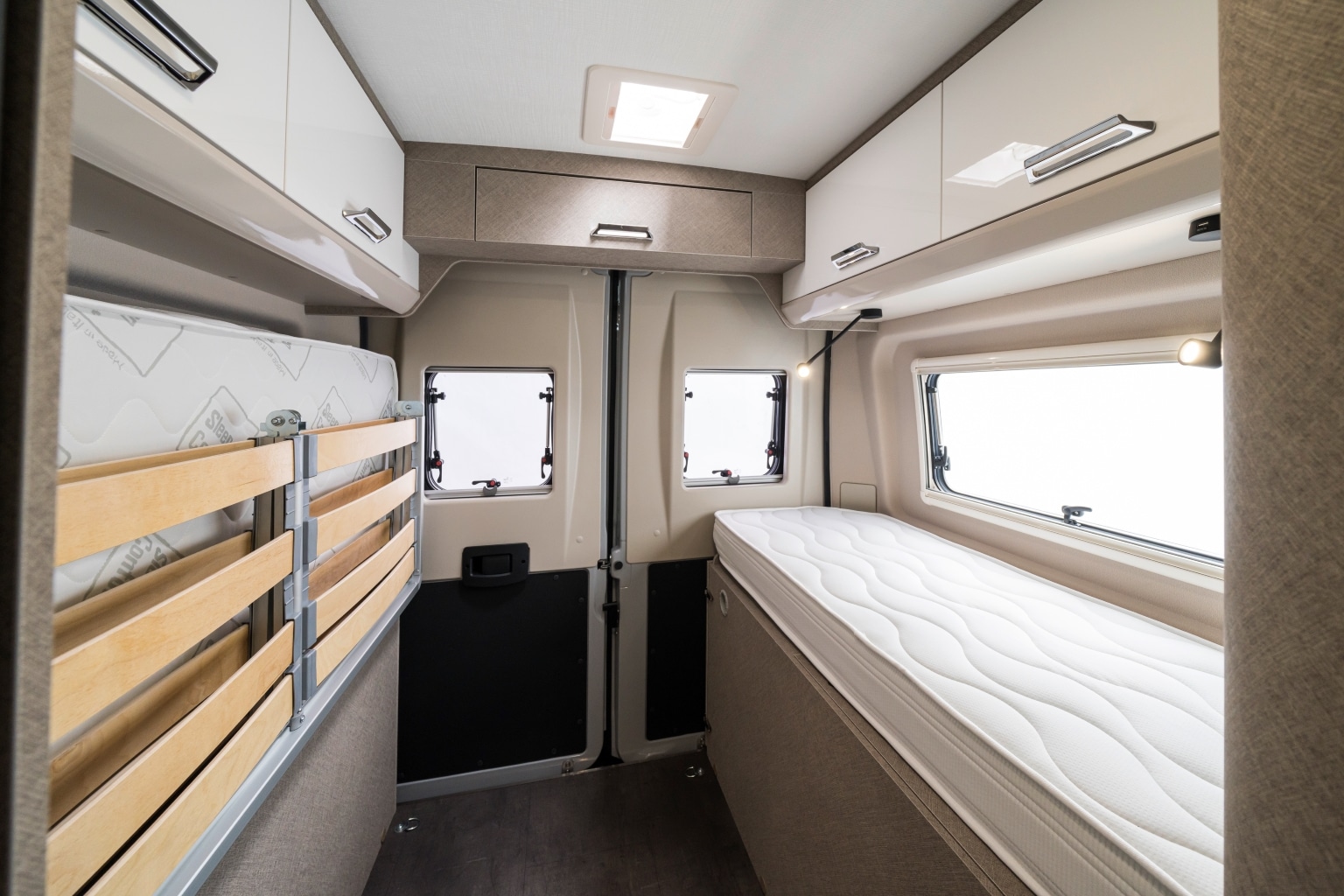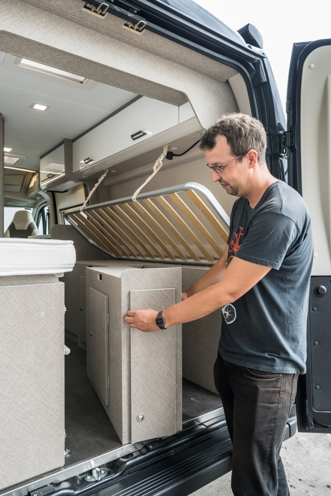 Die Garagenbreite wird allerdings durch die breiten Podeste der Betten auf 60 Zentimeter beschränkt. Um die Breite bei Bedarf auf 87 Zentimeter zu erhöhen, lassen sich die beiden Schrankelemente – die als Podest für das Einzelbett auf der Beifahrerseite dienen – praktischerweise mit wenigen Handgriffen ausbauen.