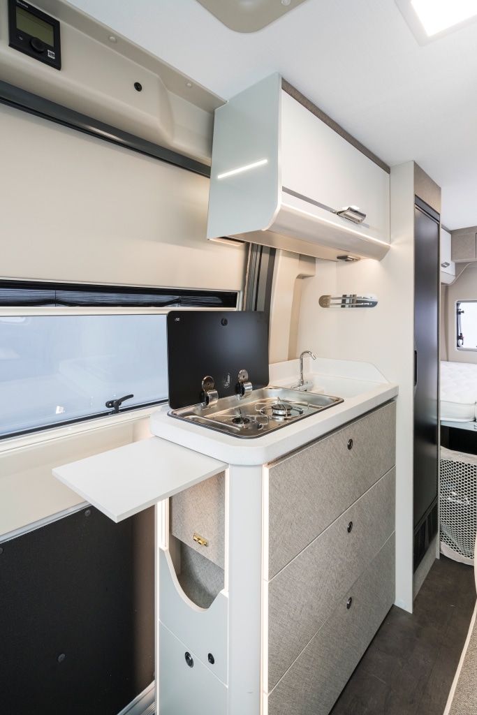 Das schafft deutlich mehr Beinfreiheit und damit erheblich mehr Komfort an der Halbdinette des Sechs-Meter-Vans. An dieser Stelle muss sich der Camper entscheiden, ob die Priorität für Längseinzelbetten die Komforteinbuße an der sicher öfter am Tag genutzten Sitzgruppe rechtfertigt.