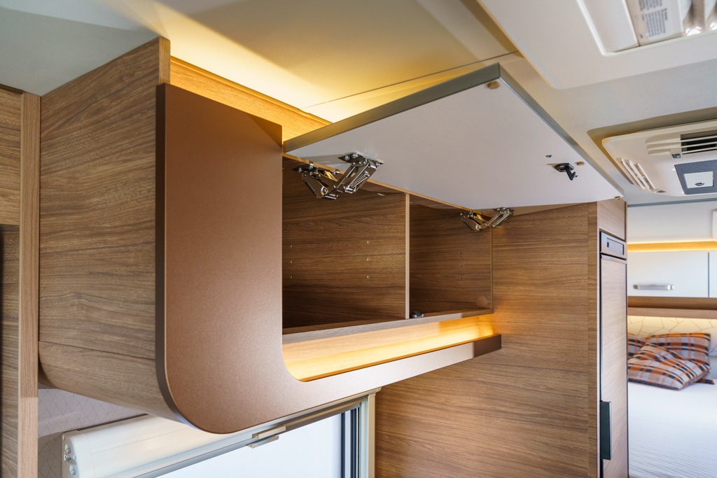 Das Interieur im Pepper wirkt elegant und schick. Es gefällt dank farbenfroher Einrichtung. Geschlafen wird im Weinsberg in 82 Zentimeter breiten Einzelbetten, die jeweils 200 Zentimeter lang sind. Um an die Kleiderschränke unter den Fußenden der Betten zu gelangen, muss der Camper in die Knie gehen, weil sich die Deckel nicht aufstellen lassen.