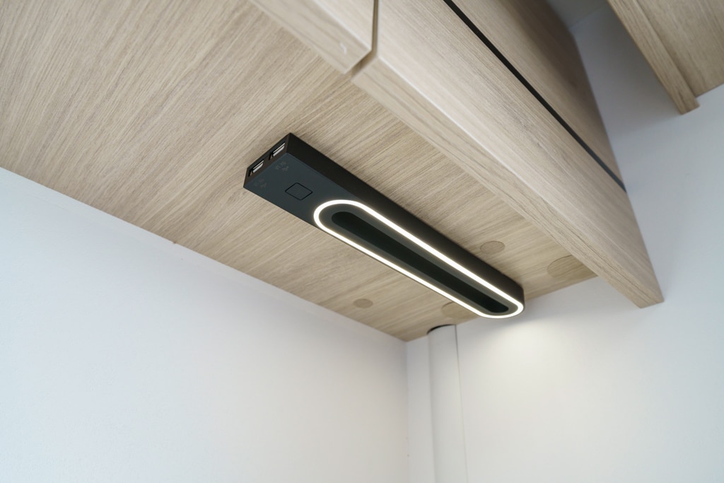 Das Waschbecken über der Kassettentoilette schiebt der Nutzer im Bad (100 mal 83 Zentimeter) zur Seite und in die separate Duschkabine (80 mal 55 Zentimeter) hinein, die mit zwei Wasserabläufen und Klapptür bestückt ist. Das ist clever gemacht und erhöht die Bewegungsfreiheit im Sanitärbereich.