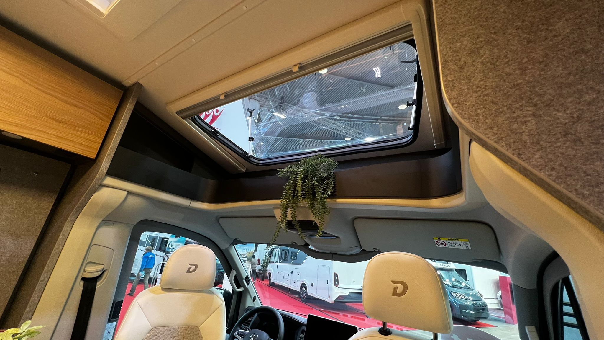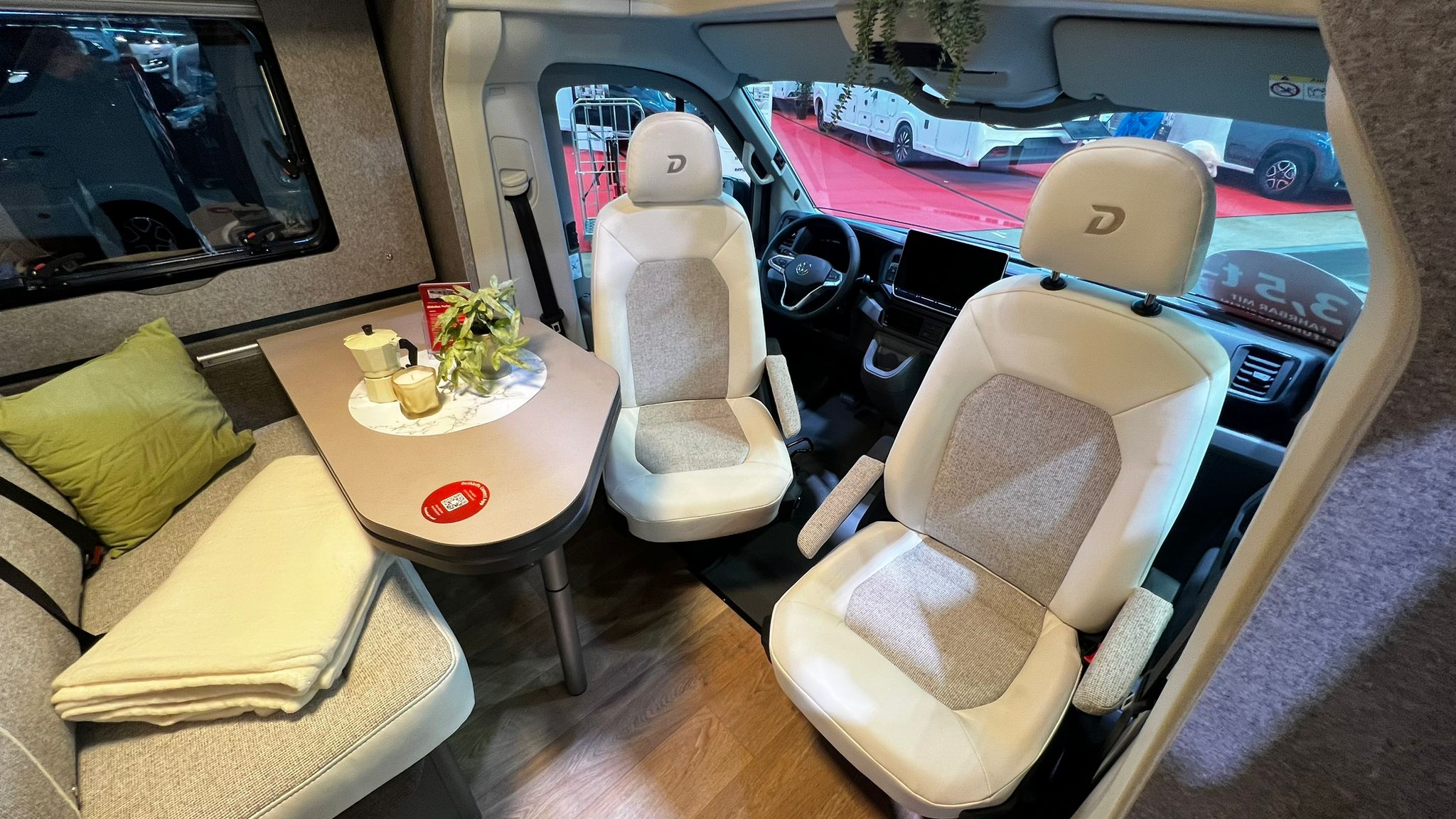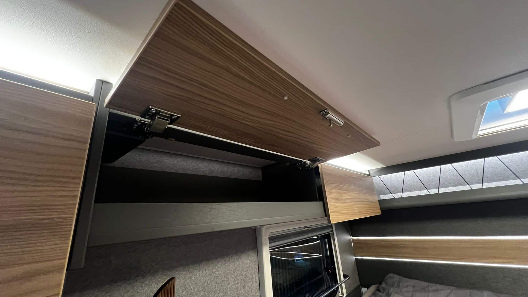 Im Inneren erwartet den Camper ein klassischer Grundriss mit Querbett, der auf zwei Personen ausgerichtet ist. Zutritt in den 220 Zentimeter breiten Aufbau erfolgt über die 70 Zentimeter breite Aufbautür mit Coupé-Einstieg und ausfahrbarer Trittstufe. Das Fenster in der T-Haube sorgt für einen angenehm hellen Innenraum. Im Wohnraum platziert Dethleffs eine Halbdinette, an die sich die Küchenzeile mit vielen Staufächern und einem höhergelegenen Kühlschrank anschließt. Gegenüber befindet sich das Bad mit Rollo-Tür. Eine Schwenkwand erlaubt die doppelte Nutzung als Bad oder Dusche. Genächtigt wird im großen Querbett im Heck (198 x 142 Zentimeter).