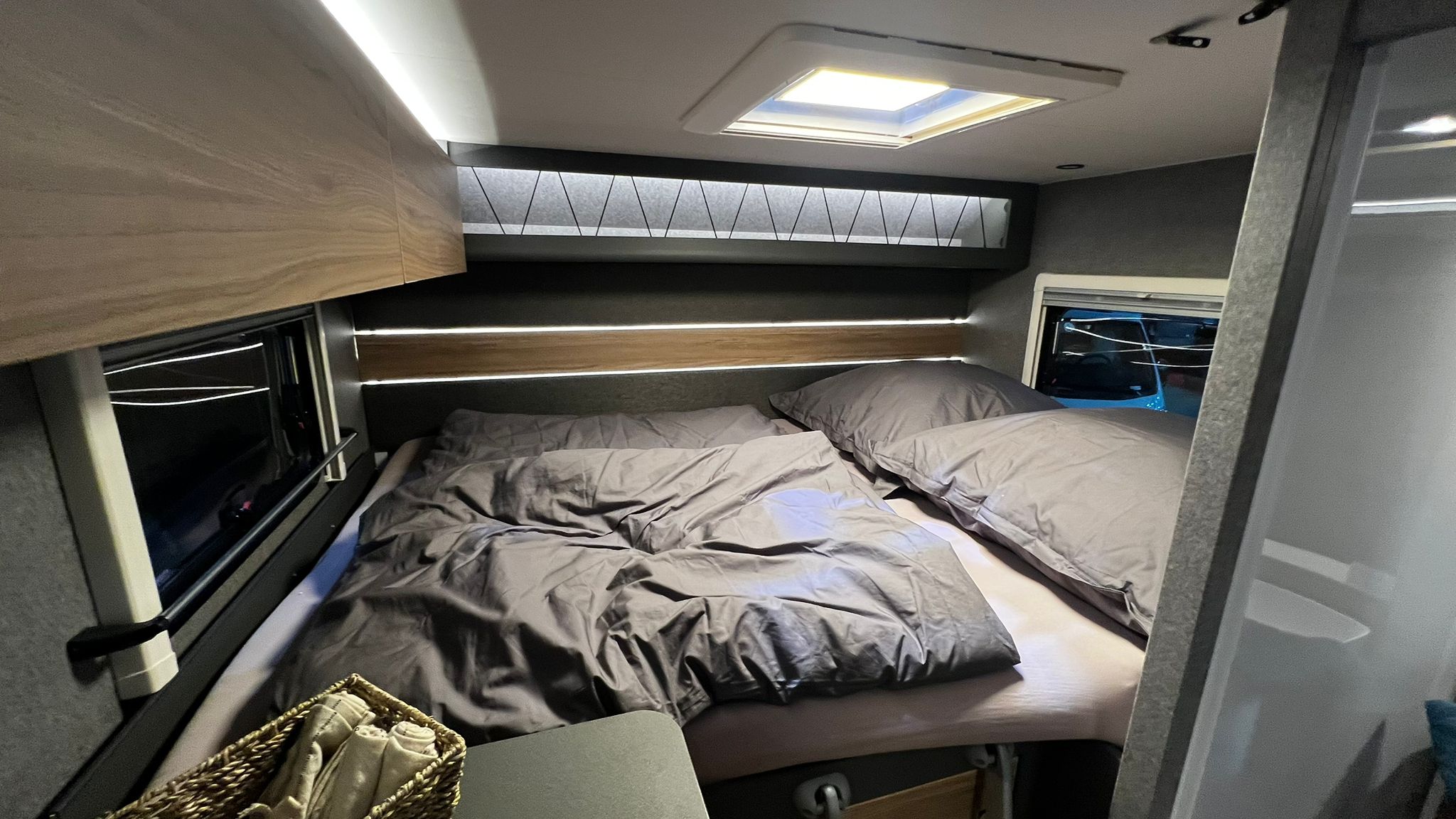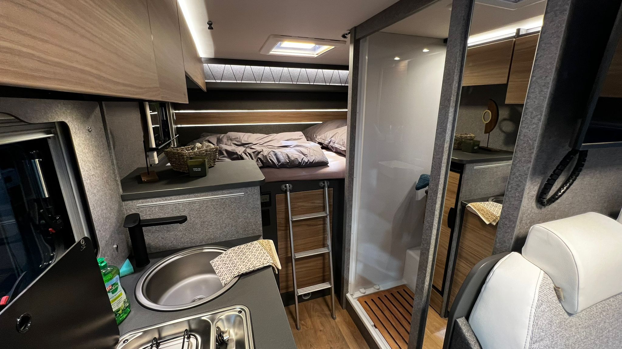 Auch äußerlich verpasst Dethleffs seinem 3,5-Tonnen Allradler mit 18 Zoll All-Terrain-Reifen auf mattschwarz lackierten Hanma-Felgen, LED-Lightbar, sowie Markise, Leiter und Reling eine gewisse Offroad-Optik. Die Fahrerhauslackierung hält Dethleffs in Indiumgrau Metallic sehr auffällig.