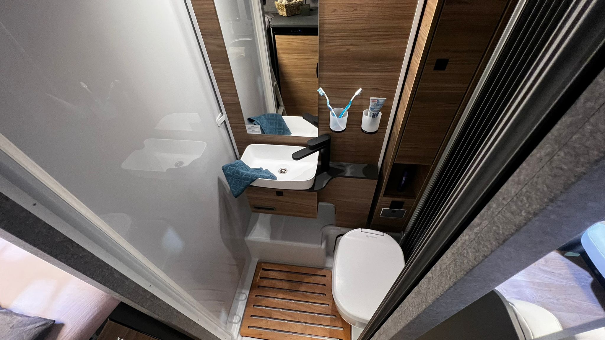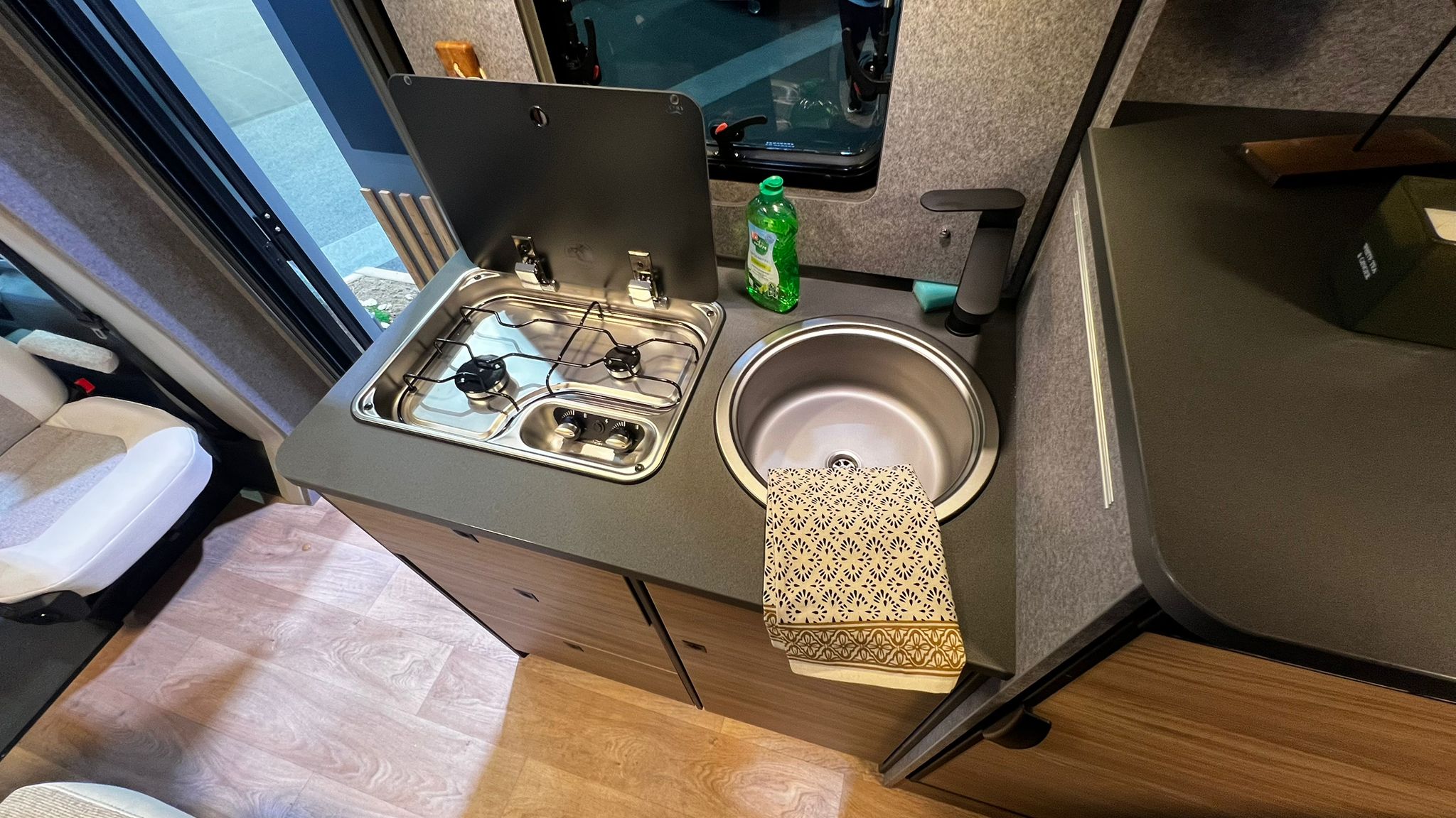 Autarkie spielt beim Thema Offroad eine wichtige Rolle. Einzig der Zwei-Flammen-Kocher wird mit Gas aus der 2,8 Kg-Gasflasche betrieben, während Dethleffs ansonsten auf eine Gasunabhängige Energieversorgung setzt. So sorgt eine Dieselheizung für Wärme und fließend Warmwasser, während der Kompressorkühlschrank elektrisch betrieben wird. Die Energie dazu liefert eine 150-Ah-Lithium-Bordbatterie, die um eine weitere Batterie ergänzt werden kann.