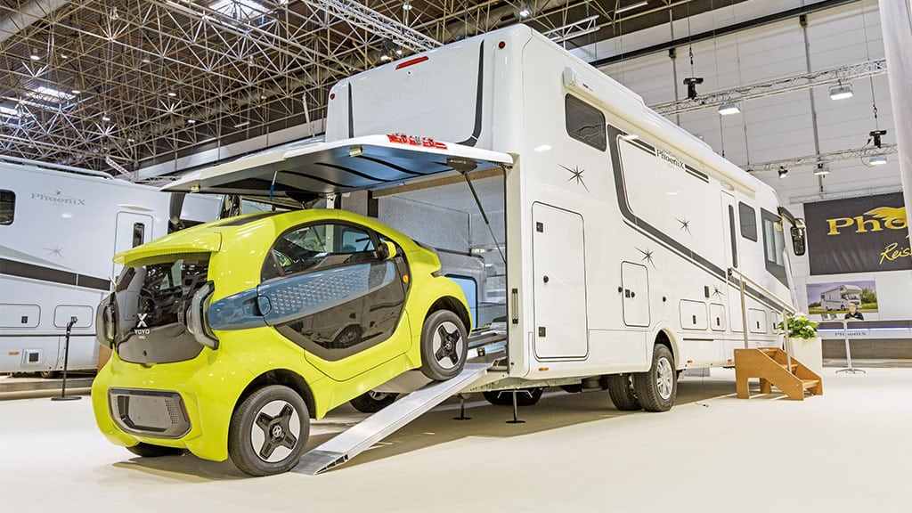 Ein Alleinstellungsmerkmal des neuen Grundrisses: Die integrierte Auto-Heckgarage, in der ein Elektro-Kleinwagen Platz findet. Der kompakte Stromer erreicht Geschwindigkeiten von über 85 km/h, bietet zwei Sitzplätze und eine Reichweite von rund 150 Kilometern. Damit ermöglicht er maximale Flexibilität und Unabhängigkeit am Reiseziel.