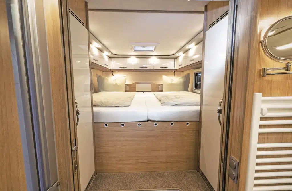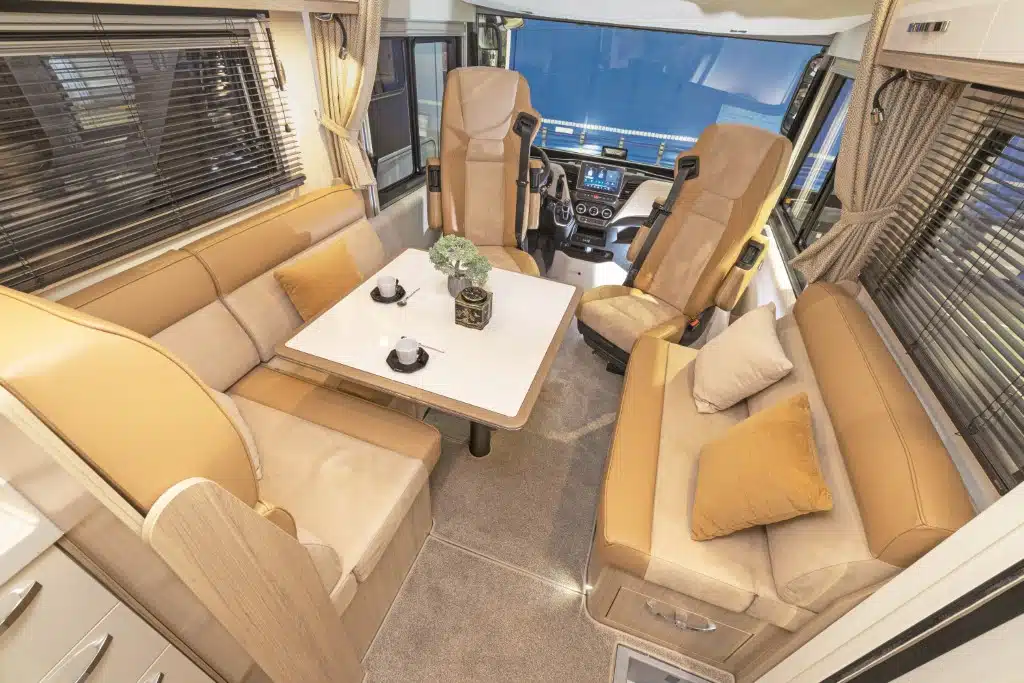 Die Frontdinette bietet bequem Platz für bis zu fünf Personen und lädt zum geselligen Verweilen ein. Optional ist ein komfortables Hubbett erhältlich, das den Wohnraum um zwei vollwertige Schlafplätze erweitert – ideal für bis zu vier Reisende. Serienmäßig sind hochwertige Oberschränke verbaut. Auf Wunsch kann mittig über dem Fahrerhaus ein 32-Zoll-Flachbildschirm integriert werden, der bei Bedarf nach vorn geklappt wird und sich somit harmonisch in das Raumkonzept einfügt.