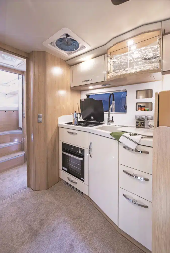 Im mittleren Teil des Reisemobils befindet sich eine großzügige Längsküche. Auf der hochfesten Mineralgranit-Arbeitsfläche sind ein Dreiflammenkocher mit elektrischer Zündung sowie eine große Rechteckspüle integriert, deren Abdeckung gleichzeitig als zusätzliche Ablagefläche dient.