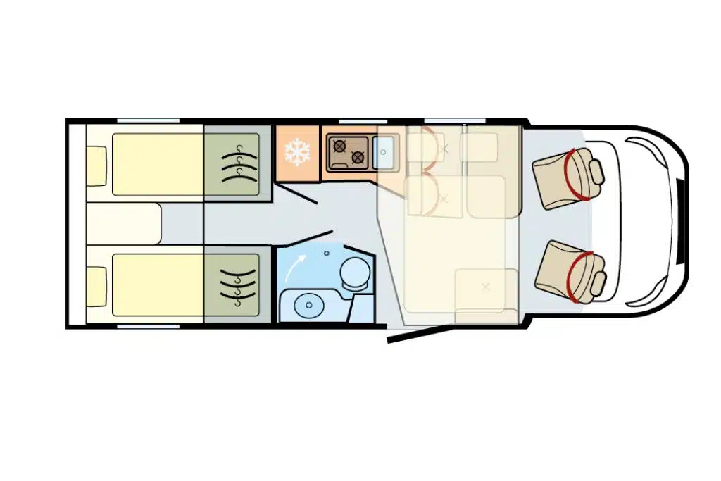 Dafür aber zwei Teilintegrierte der Super-Günstig-Baureihe Pure. Der Kunde hat die Wahl zwischen zwei je 6,99 Meter langen Modellen auf Fiat Ducato mit 140 PS (103 kW) mit Einzelbetten über der Heckgarage und Bad und Küche beiderseits des Mittelgangs davor. Den Unterschied macht die Sitzgruppe: Beim Corigon Pure T70 LS ist es eine Face-to-Face-Sitzgruppe, während der Pure T70 S auf eine Halbdinette mit Seitensitz setzt.