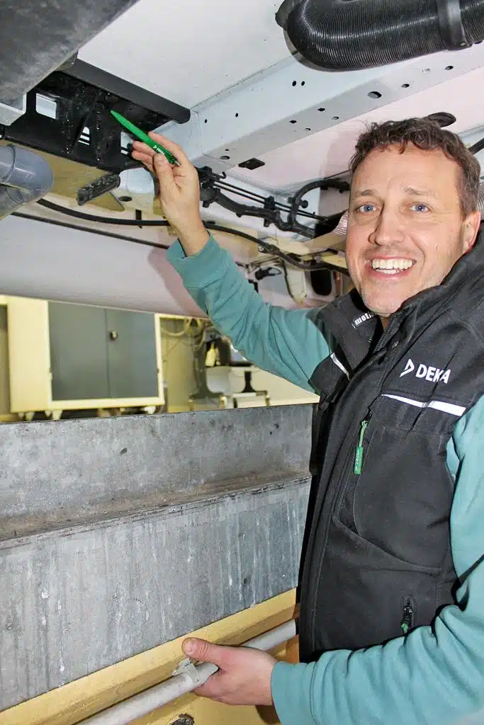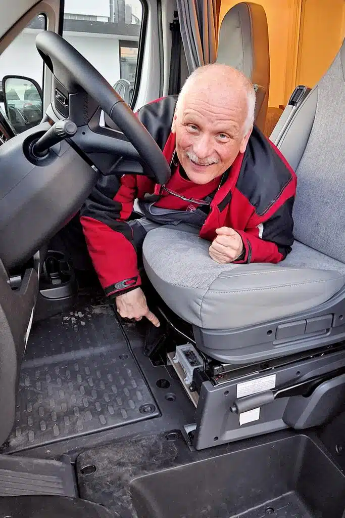Auch das kann beim Test passieren: Durch einen Bedienfehler des Redakteurs drückte die Rückenlehne des zu weit nach hinten geschobenen Fahrersitzes die Tischplatte beim Drehen nach hinten, und hebelte so eine Schraube aus der Seitenwand. Die Halterung ließe sich vergleichsweise einfach mit einem Winkel, befestigt am massiven Raumteiler zum Fahrerhaus hin, deutlich stabilisieren.