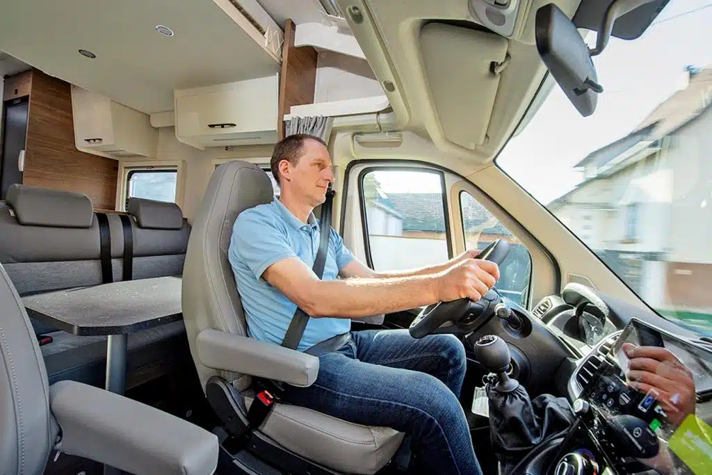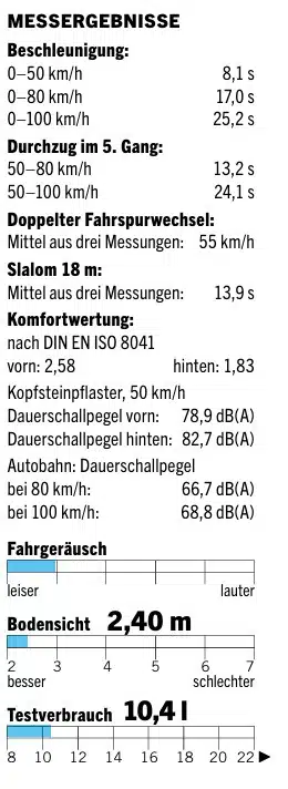 Der Corigon Pure T70 S rollt mit originalem Tiefrahmenchassis mit 3,80 Meter Radstand auf das Testgelände. Bis an seine Lastgrenze von 3.500 Kilogramm beladen, durchfährt der 6,99 Meter lange Teilintegrierte den doppelten Fahrspurwechsel mit 55 km/h und den 18-Meter-Slalom in 13,9 Sekunden. Damit schneidet der Proband bei beiden Disziplinen besser ab als der Durchschnitt. Ursächlich hierfür ist das spurstabile und dank kurzem Radstand agile Fahrwerk, bei dem das ESP erst spät eingreifen muss. Im Grenzbereich arbeitet dieses System wohldosiert. Bei der Komfortmessung zeigt sich der Teilintegrierte auf Fiat Ducato erwartungsgemäß von seiner kernigen Seite. Die Vorderachse an McPherson-Federbeinen leitet Fahrbahnstöße deutlich spürbar bis in die Fahrzeugsitze ein. Die hintere Starrachse an einlagigen Längsblattfedern absorbiert Fahrbahnunebenheiten etwas besser. Bei der Geräuschmessung bewegt sich der Corigon Pure T70 S auf üblichem Niveau. Das Motorengeräusch ist gut hörbar, aber nicht störend, die Windgeräusche an Dachhutze, Dachfenstern, Fenstern und vertieftem Einstieg bleiben im Rahmen. Die etwas schlechteren Werte beim Mobiliar sind hauptsächlich der Herd-Spülen-Kombination und dem Hubbett zuzuschreiben. Mit dem 2,2-Liter-Turbodiesel mit 140 PS (103 kW) ist der Dreieinhalbtonner ausreichend motorisiert. Wer keine Raketenstarts plant, sollte damit gut auskommen. Der Verbrauch an Diesel bleibt mit 10,4 l/100 km für ein Reisemobil dieser Größe auf Fiat Ducato erfreulich niedrig. Die Sicht für den Fahrer ist, abgesehen vom Blick nach rechts hinten wegen fehlendem Aufbautürfenster, rundum gut. Kombinierte rot-weiße Umrissleuchten am Heck würden dem Fahrer im Dunkeln die Aufbauecken anzeigen.