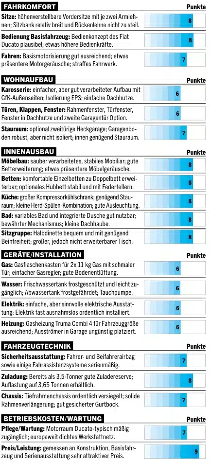 Karosserie: Boden: Sandwich 42 mm mit GfK-Unterseite; Seitenwände: Sandwich 34 mm mit GfK-Außenseite, Dach: Sandwich 33 mm mit GfK-Oberseite; Isoliermaterial: EPS; Fahrerhaus mit originaler Verglasung; Aufbau mit optionalen Rahmenfenstern; Aufbautür (B x H) 58 x 187 cm mit einfacher Verriegelung, ohne Zentralverriegelung; vertiefter Einstieg; Garage optional zweitürig; nicht isolierter Garagenboden aus Siebdruckplatte; Rahmenverlängerung unter Heckgarage; max. Traglast Heckgarage: 150 kg