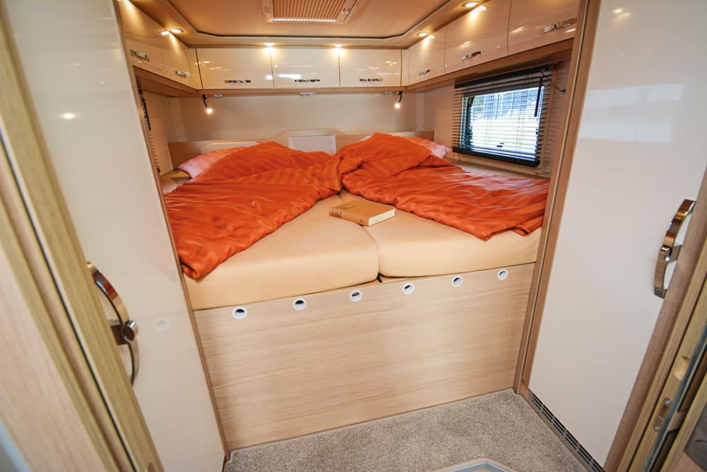 Selbstverständlich besteht der neue Phoenix Maxi Liner 9000 AY nicht nur aus Garage. Der für bis zu vier Reisende ausgelegte Liner hält über dem Pkw-Parkplatz zwei große Längs-Einzelbetten mit äußerst bequemen Matratzen bereit, und jeder der beiden Schläfer dort hat am Fußende seinen eigenen Kleiderschrank. Zwei weitere Urlauber nächtigen im optionalen elektrisch angetriebenen, ebenfalls sehr bequemen Hubbett über dem Fahrerabteil mit herrlich schnörkeligem textilem Baldachin. Vor dem Absenken der von 1,20 auf 1,40 Meter verbreiterbaren Liegefläche sind die beiden luftgefederten Vordersitze in ihre unterste Position zu bringen.