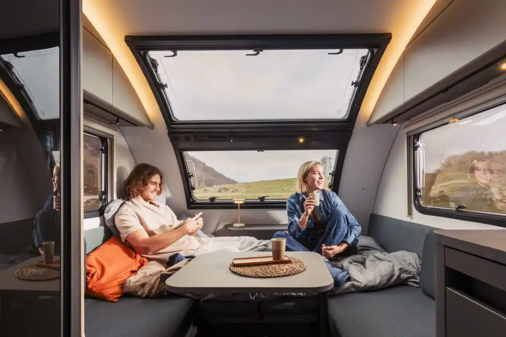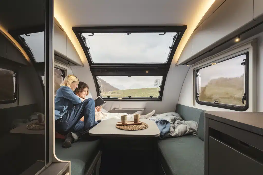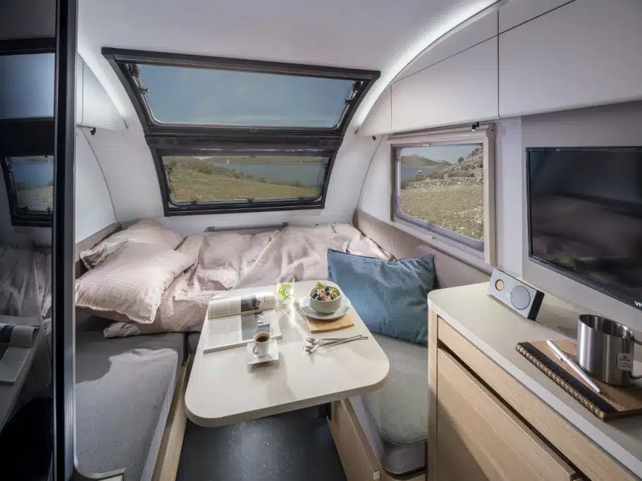 Im Inneren erwartet Reisende in beiden ein wohnlicher Stil mit hellen Farben, geschwungenen Möbeln und überraschend großzügigem Raumgefühl. Besonderes Highlight ist das doppelte Panoramafenster, das viel Tageslicht und Natur ins Innere bringt. Eine neue, einteilige Eingangstür mit Fenster und die flexible Sitzgruppe steigern Komfort und Alltagstauglichkeit. Im 391 LH lässt sich die Sitzgruppe dank verschiebbarem Lattenrost in drei Bettgrößen verwandeln. Serienmäßig sorgt die Truma Combi Heizung für angenehmes Klima.