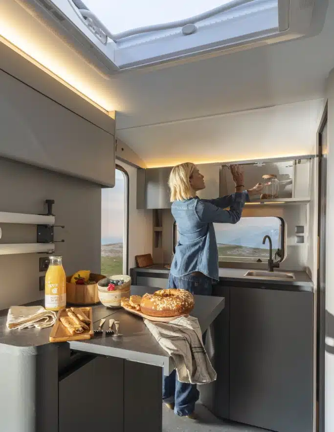 Die Küche zeigt sich als Raumwunder mit separater Spüle, Kochfeld, Apothekerschrank und optionaler Arbeitsplattenerweiterung. Ein 133-Liter-Kühlschrank, beidseitig zu öffnen, sowie ein optionaler Backofen runden die Ausstattung ab. Das neu gestaltete Bad überzeugt mit schwenkbarer Duschwand, festem Waschbecken und cleveren Stauraumlösungen.