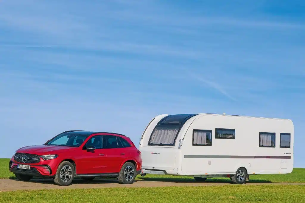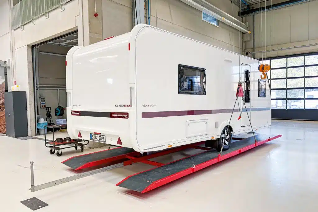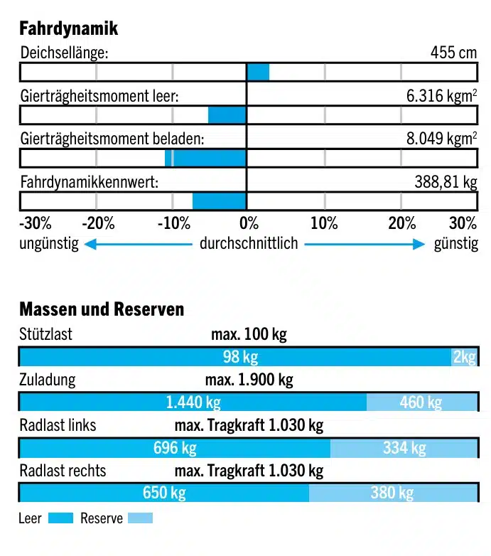 Beim Chassis ist mit Schräglenkerachse, Stoßdämpfern, mechanischer Stabilisierung und Leichtbauchassis fast alles verbaut, was die Mittelklasse braucht. Auflastungen gibt es nicht. Der Testwagen bringt es bei 1.900 Kilogramm Gesamtmasse auf 460 Kilogramm Zuladung. Leer hat der 572 UT aber schon knapp 100 Kilogramm Stützlast, allerdings mit serienmäßigem Ersatzrad im Deichselkasten. Mit dieser Gesamtmasse darf der 572 UT für seine Größe vergleichsweise schwer sein. So sind die Werte aus den Pendelversuchen nicht so einfach zu interpretieren, denn mit dem hohen Gewicht für seine Größe steht er im Vergleich der Größenklasse schlechter da als gleich große, aber leichtere Wagen. Die Auswertung der Pendelversuche zeigt denn auch: Auf seine Grundfläche bezogen liegen wesentliche Messwerte deutlich im ungünstigen Bereich. Das Gierträgheitsmoment GTM für den beladenen 572 UT ist gut zehn Prozent schlechter als der Durchschnitt seiner Größenklasse. Verglichen mit anderen Caravans seiner Gewichtsklasse ist das GTM aber gut acht Prozent besser. Die Adria-Ingenieure haben ihm eine vergleichsweise lange Deichsel spendiert, die sich positiv auf die Fahrstabilität auswirkt. So ist sein Fahrdynamikkennwert FDK nur gut sechs Prozent schlechter als der Durchschnitt gleich großer Profitestkandidaten. Im Kreise der 1.900-Kilogramm-Caravans ist sein FDK über vier Prozent besser. Auf der Straße zeigt er sich hinter dem Mercedes vorbildlich.