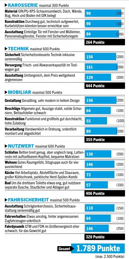 Hinter der gelungenen neuen Optik des Adora verbergen sich technische Feinheiten wie der XPS-Schaum und pfiffige Möbellösungen. Es sind aber neben dem aufwendigeren Aufbau und dem neuen Innendesign auch etliche bekannte Details gegenüber dem letzten Adora im Profitest verbessert worden, die weniger direkt auffallen, trotzdem wichtig sind und die kleinen Schwächen korrigieren. Wer einen soliden mittelgroßen Caravan für zwei mit Einzelbetten und Dusche sucht, sollte sich diesen Adria auf alle Fälle näher ansehen.