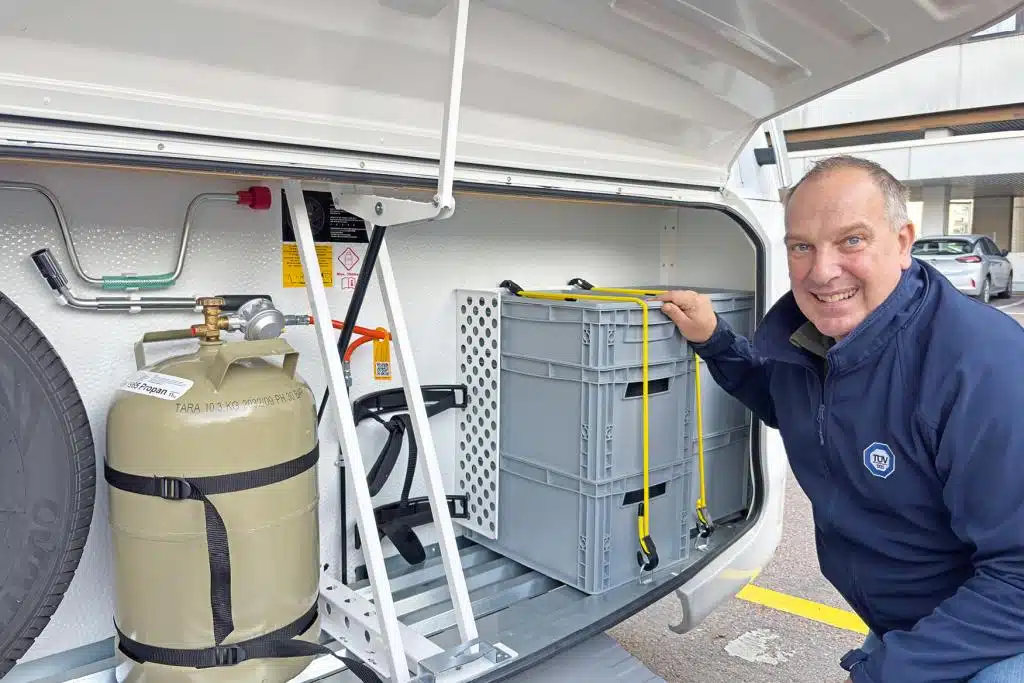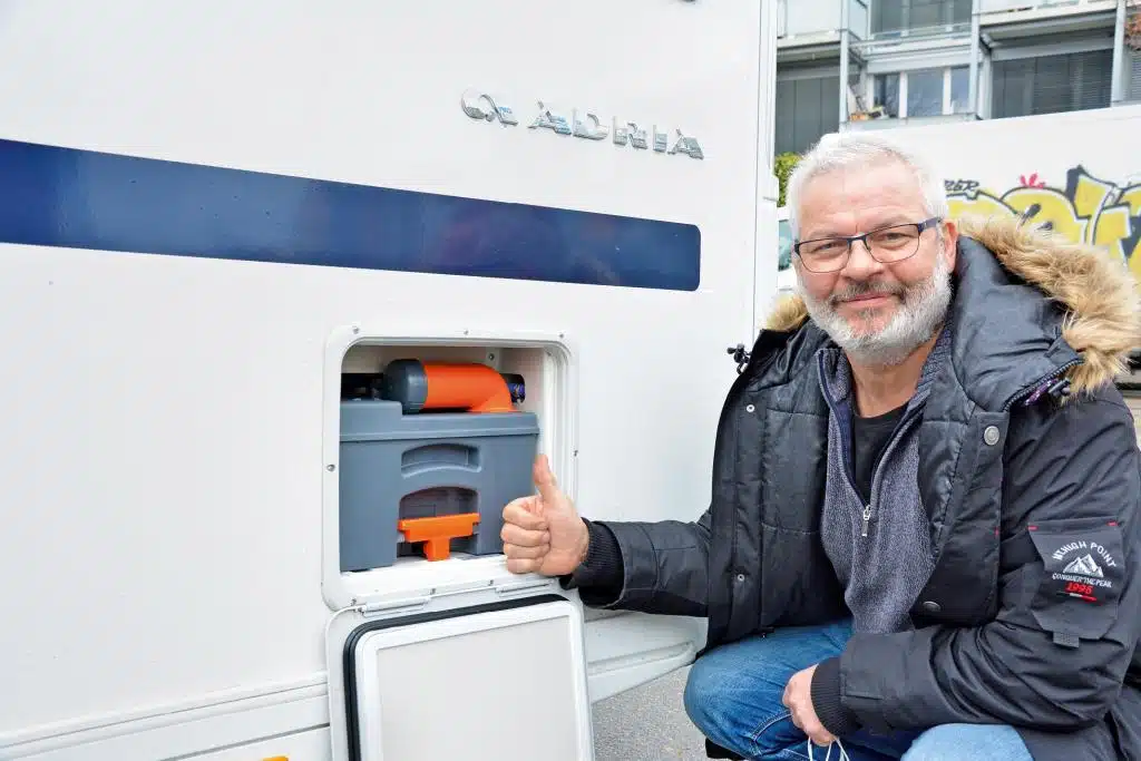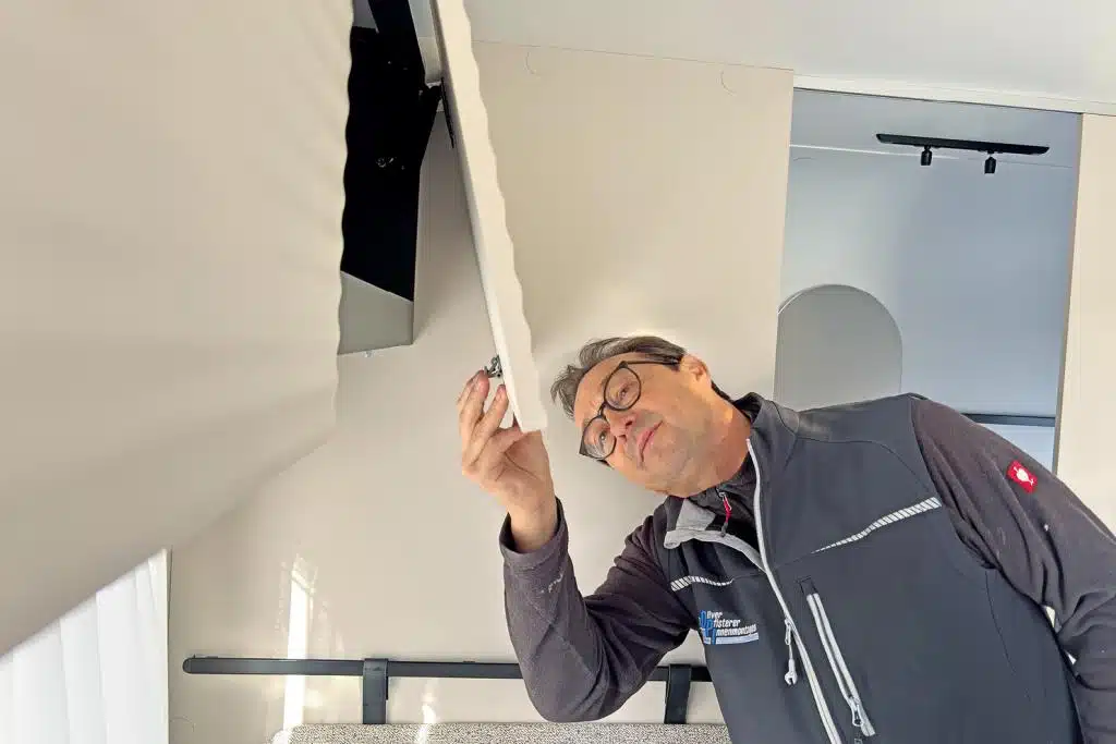 „Die vorgeschriebene Beleuchtung ist komplett mit LED bestückt, und natürlich ist außen von der Beleuchtung bis zu Kantenradien alles vorschriftsmäßig“, bestätigt TÜV-Ingenieur Roman Heinzle. Unter dem Wagen lobt er die gute Aufhängung beziehungsweise Verlegung der Leitungen für Elektrik, Gas und Wasser. Der Gaskasten ist mit dem durchbrochenen Blechboden perfekt entlüftet, die Klappe öffnet weit, „so kommt man gut an das serienmäßige Ersatzrad und die Stauboxen im Testwagen.“ Innen gefällt ihm die gemischte Beleuchtung mit Spots und indirektem Licht. Die Minispots als Deckenlicht in der Sitzgruppe und im Gang zwischen den Betten muss man fast suchen, „sie sind aber tatsächlich hell genug“, staunt Heinzle. Im Bad findet der Ingenieur die Ausleuchtung mit zwei Spots über der Schiebetür und indirektem Licht hinter dem Spiegel über dem aufgesetzten Waschbecken und auch in der Dusche „ziemlich perfekt“. Die Steckdose neben der Toilette muss auch er suchen, „die dürfte besser zugänglich sein, auch wenn mit der Dusche grundsätzlich Vorsicht geboten ist“.