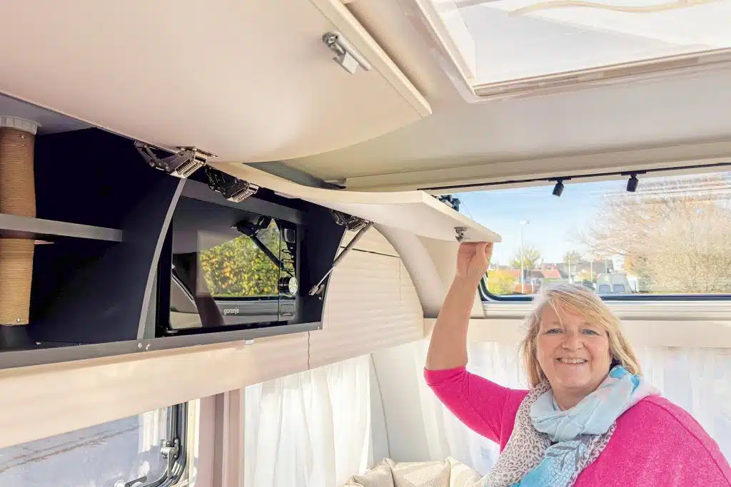 Die Küche gegenüber der Tür überzeugt mit Dunstabzug und der schicken Einheit von Spüle und Dreiflammkocher, „so lässt sich das Kochfeld leicht reinigen.“ Außerdem gibt es von Adria ein auf die Spüle passendes Abtropfbrett, das auf den Kocher passt. Den linken Oberschrank teilt ein Fachboden, den rechten nimmt die Mikrowelle ein, „die ist aber ein Extra, serienmäßig gibt es hier Stauraum.“ Mit dem schmalen Korbauszug eignet sich der Schrank unter dem TV-Halter bestens für Vorräte. Die geteilten Auszüge unter der Arbeitsfläche machen es leicht, Ordnung zu halten. Im 150-Liter-Kompressorkühlschrank kommt jede Menge Kühlgut bestens organisiert und erreichbar unter.