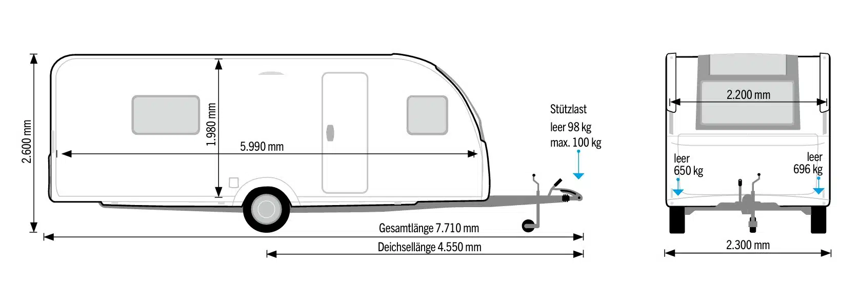 Innenausstattung: Maße (H x B x T): 198 x 220 x 599 cm, Umbausitzgruppe 210 x 122/129 cm, Betten 80 x 201 u. 80 x 194 cm, 9 Hängeschränke unterteilt, 3 Sitzstaukästen, 2 Kleiderschränke 88 x 58 x 34 cm, TV-Platz mit Schrank 50 x 70 cm, zwei Einlegeböden, schmaler Auszug