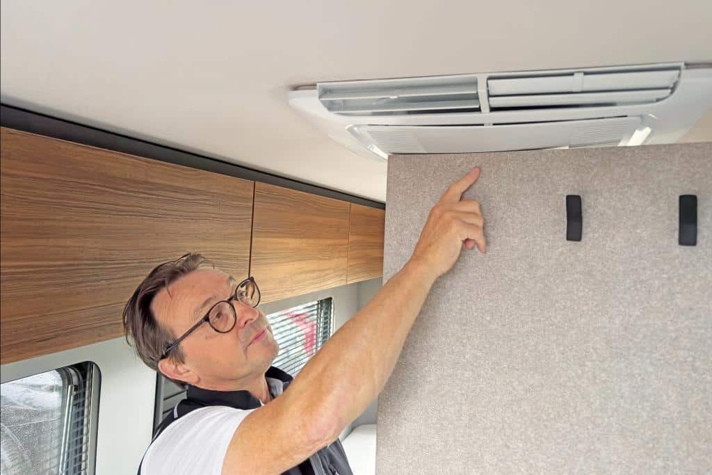 Die Verarbeitung ist anstandslos, so viel wird schnell deutlich. Kanten, Umleimer, Stoßfugen, das alles ist sauber ausgeführt. Die Abdichtung in den Nassbereichen ist ebenfalls gut, Schwächen findet der Möbelprofi aber in der Konstruktion und der Montage. So schleifen die Türen von Bad und Kleiderschrank an der Klimaanlage, „das muss nicht sein, kann natürlich an der Vorserie liegen.“ Und mit dem gerafften Duschvorhang an der Wand bleibt die Toilette nicht offen. „Auch das ein Unding, wenn jedoch leicht zu ändern. Und die unschön an die Wand geschraubte Radlaufverkleidung im Bad über dem schicken Boden ist auch ein optischer Ausreißer.“
