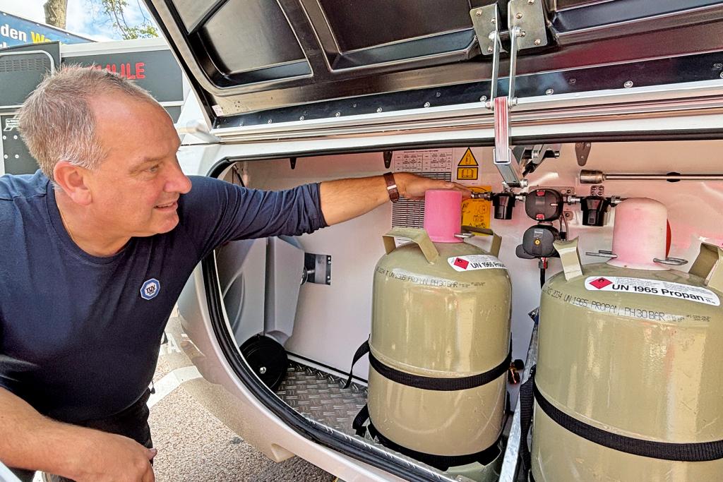 Nach einer Runde um den „schlichten und wertigen Novaline“ so TÜV-Ingenieur Roman Heinzle, gilt sein Blick dem Flaschenkasten. Die Gasbehälter sind doppelt gesichert und die Entlüftung reicht aus, da ist alles in Ordnung. Etwas unpraktisch sind die mit dem Halter verschraubten Gurte für die Flaschen, „wenn man diese schon fixiert, dann doch so, dass alle Schnallen gut erreichbar sind“, tadelt Heinzle.