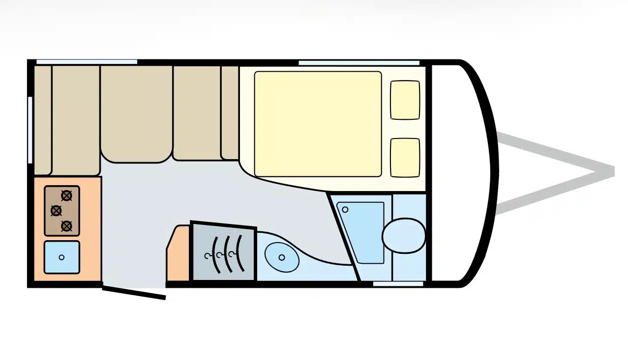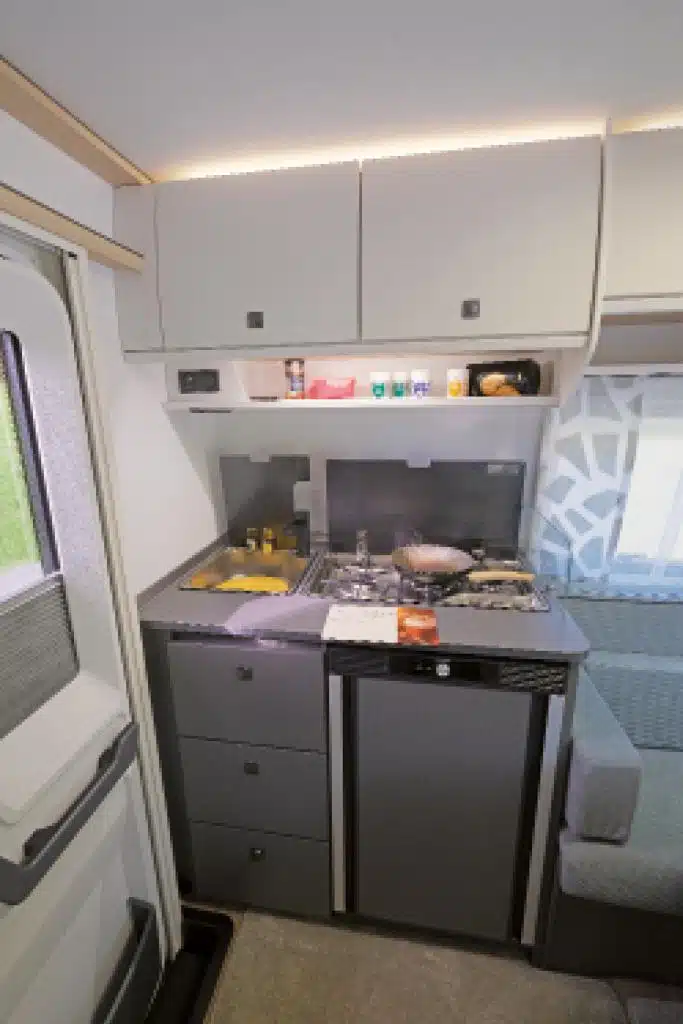 Stauraum und Kocher sind völlig in Ordnung für zwei unterwegs im Reisecaravan. Die Dinette daneben ist klein, aber fein. Spezielle Seitenpolster bieten die perfekte Armablage, fast wie auf einem Sofa, „und man kann sich sogar regelrecht in die Ecken kuscheln“.