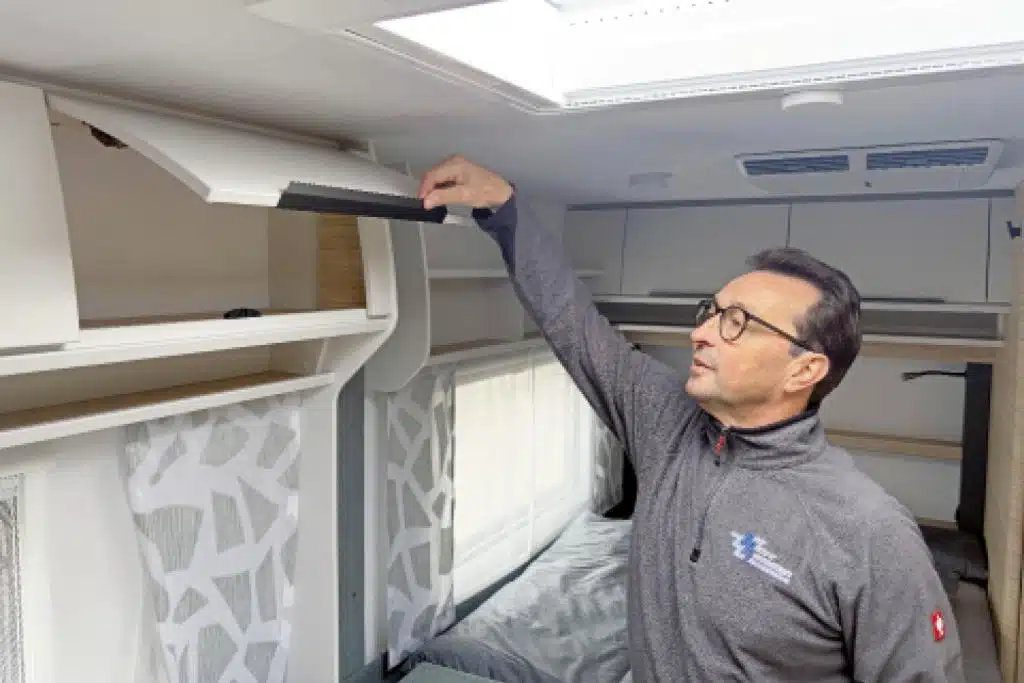 Die Apero-Einrichtung ist erwartungsgemäß auch gut konstruiert und gebaut. Die nicht direkt sichtbaren Beschläge sind von guter Qualität, die Auszüge und Küchenoberschränke schließen per Softclose, alle anderen Klappen wollen von Hand sachte geschlossen werden. Der Tisch ist an der Wand eingehängt, eine sinnvolle Lösung für die kompakte Dinette. Alle Küchenmöbel und die Schranktüren schließen Pushlocks. Die weiteren Oberschrankklappen haben ordentliche Schnäpper, „die ausreichende Zuhaltekraft entwickeln für Stauraum, in dem nur eher leichte Ladung Platz finden sollte.“ Etwas unelegant findet Pfisterer die Verbindung des Regals längs über dem Bett mit den Deckenschränken über dem Kopfende, „aber ein Eckelement wiegt mehr und kostet etwas mehr.“