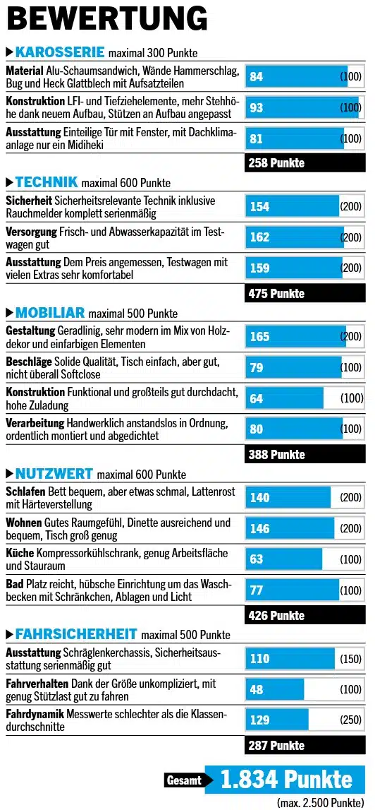 Immerhin sind der Wassertank und der große Bettstauraum ja links positioniert. Die Messwerte sind für den kompakten und für seine Größe relativ schweren Wagen nicht ganz einfach einzuordnen. Hier liegen die Ergebnisse extrem auseinander, je nachdem, ob man ihn mit gleich großen oder gleich schweren Wagen vergleicht. Deshalb finden beim Apero 390 FH Mittelwerte Eingang in die Bewertung. Anders wäre jeder Vergleich unfair. Zumal das Fahrverhalten in der Praxis unproblematisch ist, was die Werte vom Prüfstand nicht unbedingt erwarten lassen.