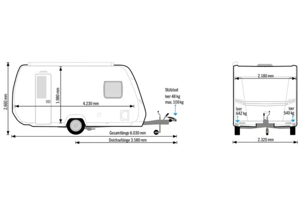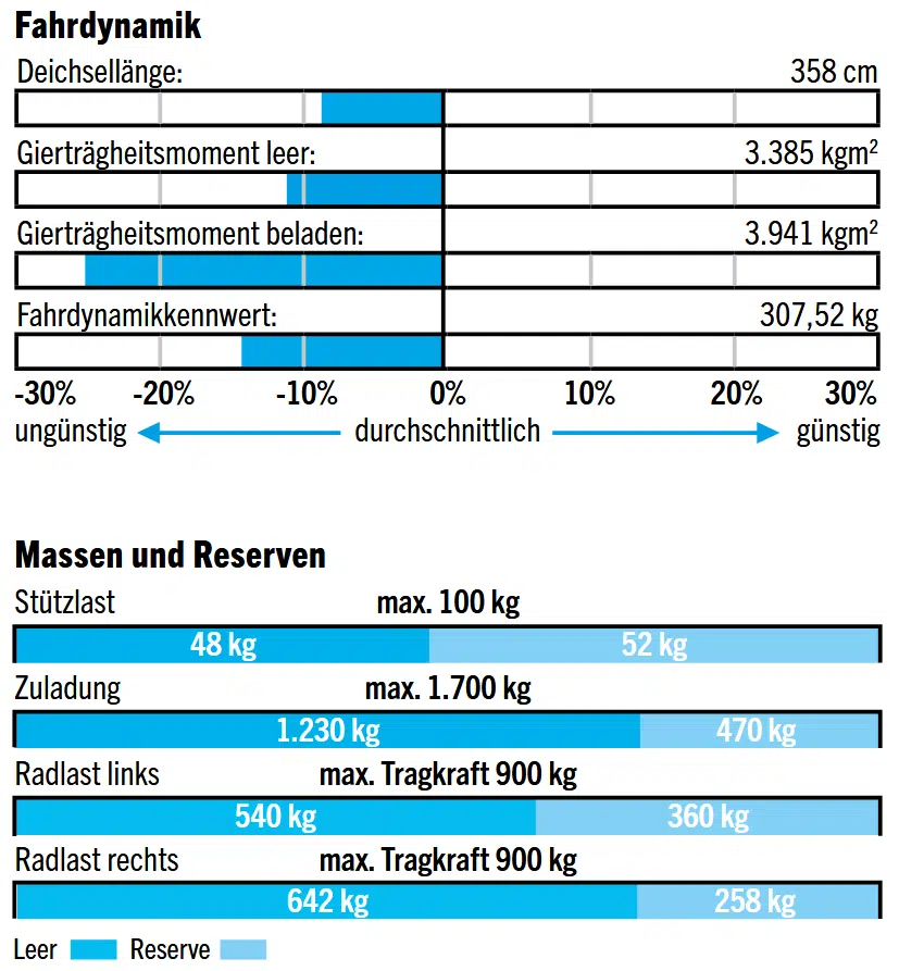 Größe ist Gewicht, und der Testwagen ist überraschend leicht, hätte selbst ohne die volle Auflastung mit den schweren Extras noch eine akzeptable Zuladungsreserve, da er eben sehr klein ist. Aber die Stützlast ist für den leeren Wagen schon ordentlich. Was mit der Küche im Heck aber kein Fehler sein muss.