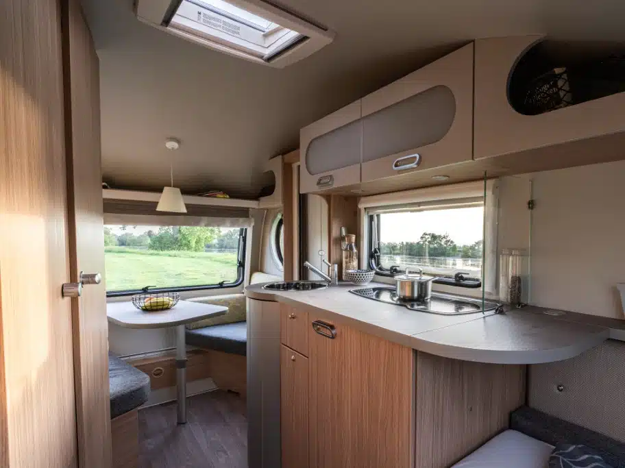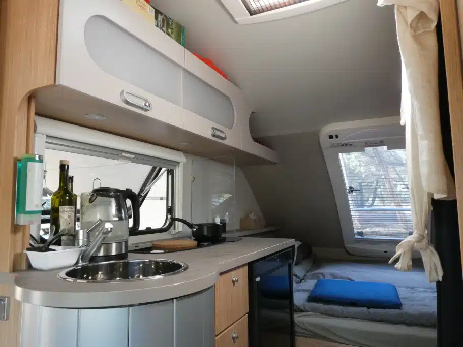 Ein Wermutstropfen: Der Durchgang zwischen Küche und Bad ist mit nur 52 cm recht schmal. Wer sich bei schlechtem Wetter länger im Innenraum aufhält, merkt schnell die Grenzen des Konzepts. Für das klassische Sommercamping spielt das aber kaum eine Rolle.