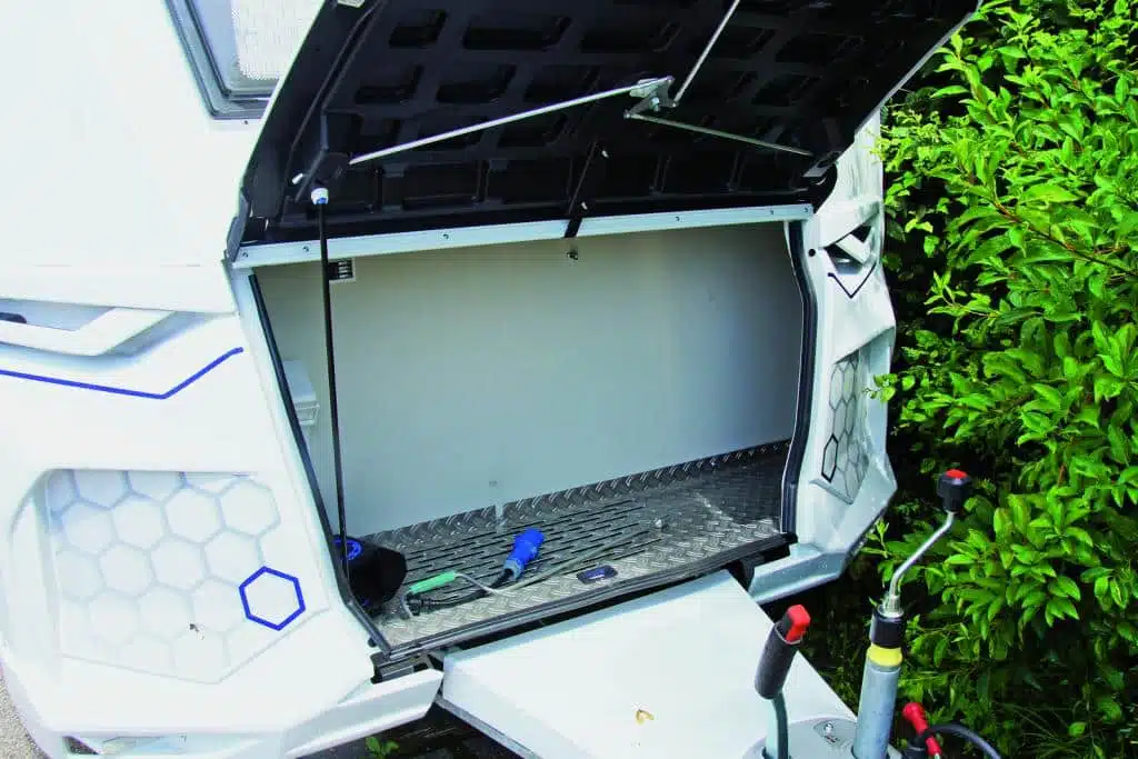 Der Yaseo ist speziell für E-Autos konzipiert. (Hier gehts zum Fahrtest: Mit E-Auto und dem aus Yaseo 500 DK nach Finnland) Gasflaschen gibt es in diesem Wohnwagen nicht. Der Bugstauraum kann folglich für Material anderer Art genutzt werden. Der Herd hat zwei Induktionsplatten, die mittels Landstrom von außen oder über den 230-Volt-Ausgang des E-Autos gespeist werden. Der Induktionsherd kann ohne Landstrom nur dann betrieben werden, wenn man die Leitung vom 230-Volt-Ausgang des Autos zum Wohnwagen legt. Wer sich unterwegs einen Kaffee kochen will, muss also erst das Kabel anbringen.