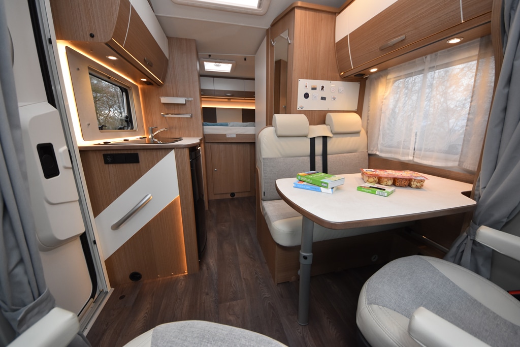 Das Raumvolumen ist nicht zuletzt dank des hochaufragenden Alkovens gewaltig und lässt schnell vergessen, dass man sich in einem nur sechs Meter langen Wohnmobil befindet. Die Stehhöhe im Eingangsbereich beträgt bis zu 236 Zentimeter. Das Design mit dunklen Möbeloberflächen samt weißen Akzenten und hellen Polstern bleibt angenehm unaufgeregt und zurückhaltend. Das Mobiliar macht einen stabilen Eindruck, Klappergeräusche während der Fahrt entstehen kaum. Carado verbaut in dem Fahrzeug mehrfach unterteilte Oberschränke mit gerundeten Kunststoff-Schließblechen und Softeinzug – das stünde auch manch teurerem Mobil gut zu Gesicht.